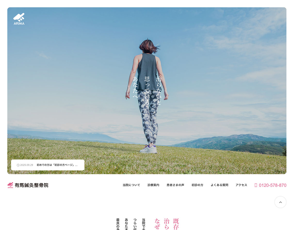 - 羽曳野市の整骨院、有馬鍼灸整骨院の公式サイト。構成から写真撮影(一部素材写真あり)、CMS構築、マテリアルデザインを担当いたしました。「治らないと思い込むことをやめて根本的に治していきましょう。」というコンセプトに沿ったイメージとコンセプトカラーに沿ってWEBサイトの各パーツのデザインや写真撮影をおこないました。有馬鍼灸整骨院の理念や治療方針、治療方法の説明をわかりやすくまとめると共に、初診時の注意点やアクセスの仕方なども簡潔にわかりやすく掲載しました。各ページのコンテンツはWordPressで更新いただけるTCDテーマによるCMSを構築しました。